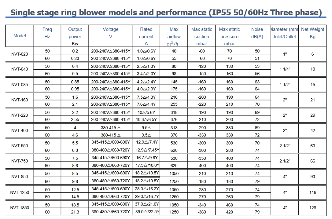 Norvax Single stage ring blower model NVT-160 1.6kW Three phase